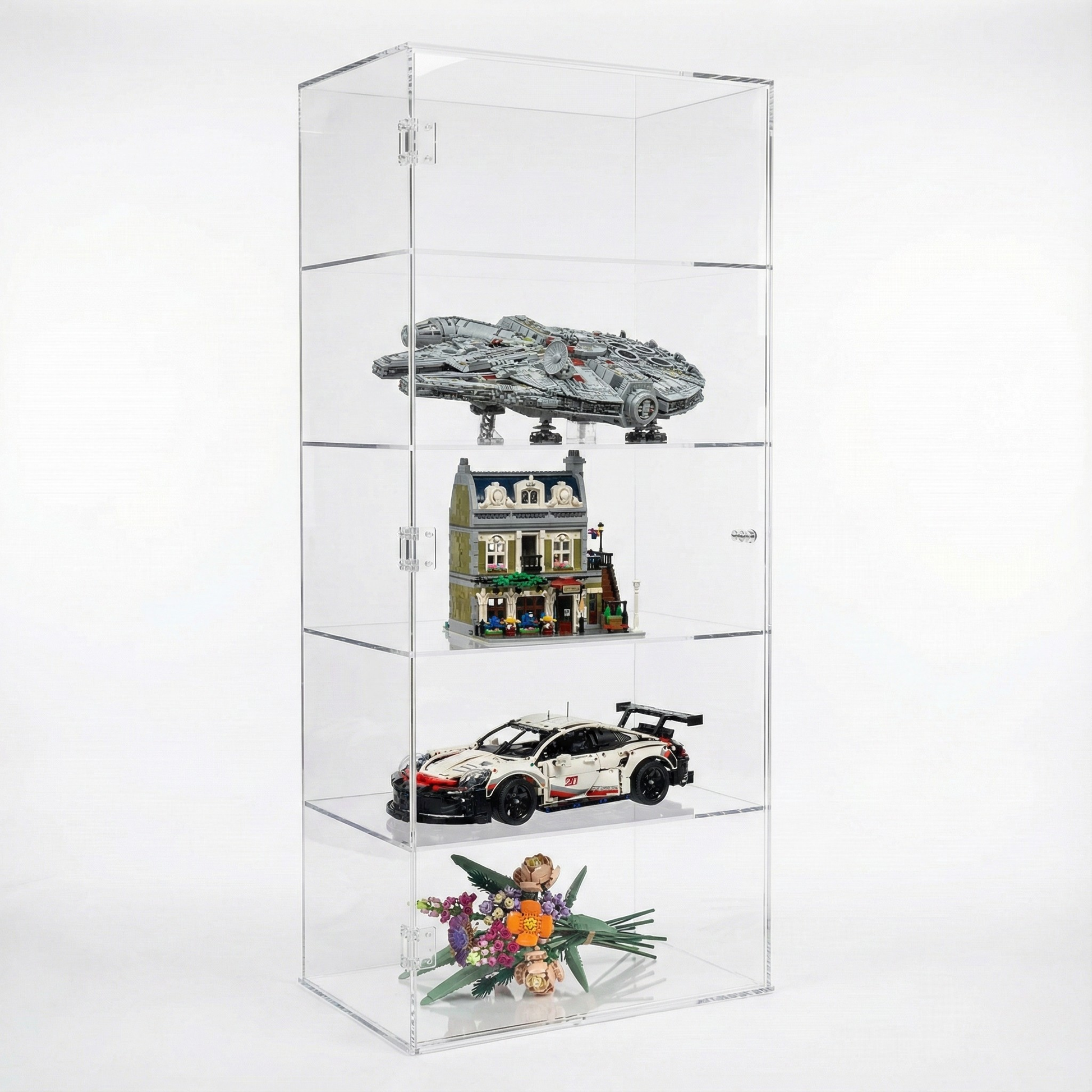 Acceso mediante puertas: Posibilidad de incorporar puertas frontales o laterales equipadas con bisagras transparentes de alta resistencia, manteniendo la estética limpia y minimalista sin herrajes metálicos a la vista.